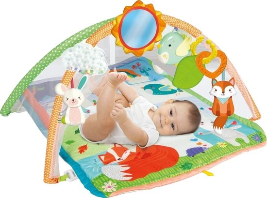 Een kleurrijke sportschool met veel activiteiten waarmee het kind met de ouders of zelfstandig kan spelen. Met hangers van zacht plastic en textiel om de kinderhandboeken, visuele en auditieve vaardigheden te ontwikkelen. De kleine vogel reproduceert witte geluiden en muziek die speciaal is ontwikkeld om het kind welzijn te bieden. De staart van de zachte vos is perfect voor het spelend kietelen, terwijl het piepen in de buik van het konijn uitnodigt om een kussen-spel te spelen. De zon is een spiegel om de glimlach en de herkenning te stimuleren.
