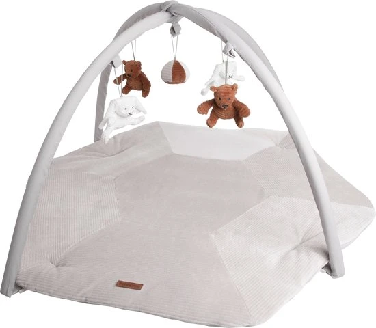 Op dit speelkleed in hexagon vorm ontwikkelt je kindje de zintuigen horen, zien en voelen. Het speelkleed bestaat uit een mat en twee bogen die eenvoudig aan de mat vastklikt. Door het gebruik van de prachtige rib corduroy stof, past dit speelkleed perfect bij de andere accessoires uit de Sense collectie. Naast de kleurcombinatie caramel, kiezelgrijs en wit, is de babygym ook in andere kleurcombinaties beschikbaar.