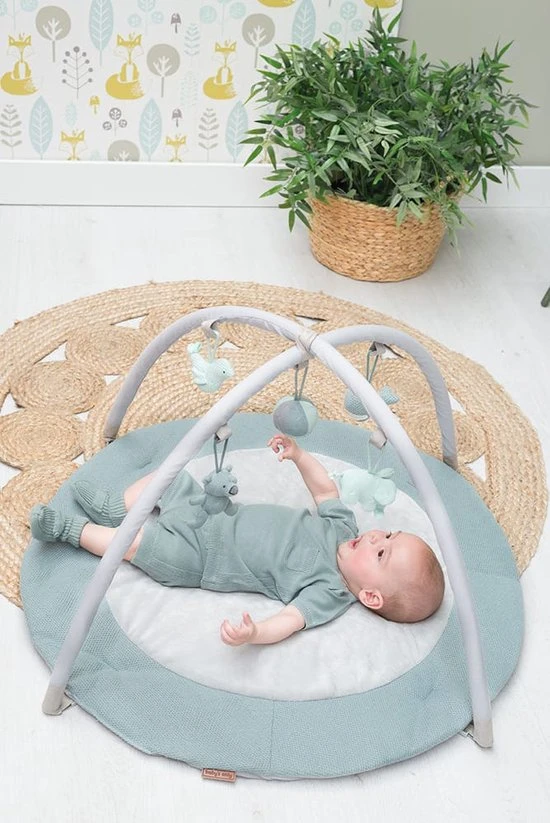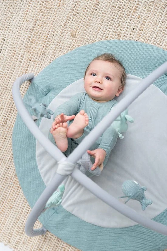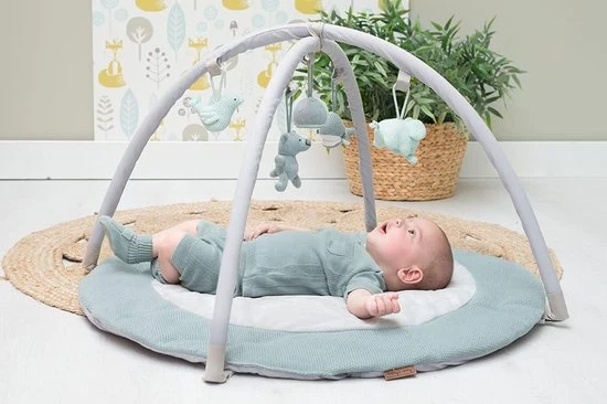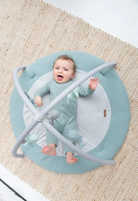 Het speelkleed bestaat uit een ronde speelmat en twee (verwijderbare) bogen die je eenvoudig kunt vastklikken. Het zachte breiwerk en in het middenstuk een nog zachtere teddystof, zorgen ervoor dat je kindje comfortabel en zacht ligt. De bekende knuffels uit de collectie hangen in mini-uitvoering aan de twee speelbogen. Veel speelplezier gegarandeerd. Naast de kleur stonegreen/mint/wit is dit speelkleed verkrijgbaar in diverse andere kleuren.