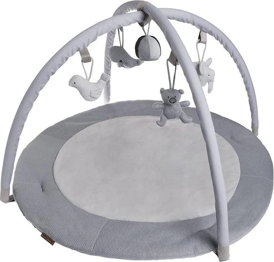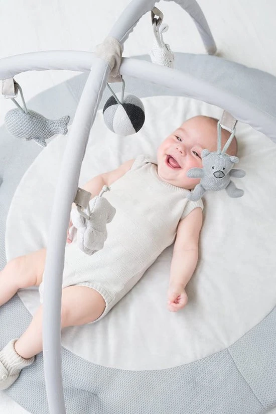 Het speelkleed bestaat uit een ronde speelmat en twee (verwijderbare) bogen die je eenvoudig kunt vastklikken. Het zachte breiwerk en in het middenstuk een nog zachtere teddystof, zorgen ervoor dat je kindje comfortabel en zacht ligt. De bekende knuffels uit de collectie hangen in mini-uitvoering aan de twee speelbogen. Veel speelplezier gegarandeerd. Naast de kleur grijs/wit is dit speelkleed verkrijgbaar in diverse andere kleuren.