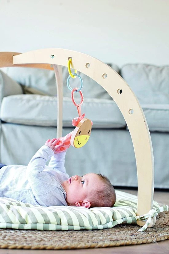 - Babies lie on a soft grey striped textile blanket, while three hangers provide fun for playing: a mirror cloud with textile raindrops, a giraffe made of wood and textile with cinching function and a lion of textile with beep function.