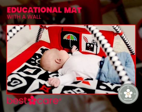 - ⭐ met wand en boeken – De bladzijden van de boeken die aan de zijkanten van de mat zijn geplaatst, kunnen worden omgeslagen, waardoor de beelden die het kind ziet niet vervelen en bovendien het gezichtsvermogen stimuleren. Dankzij de afneembare zijkanten kunnen peuters die de neiging hebben het hoofd naar één kant te houden, gemotiveerd worden om het om te draaien en op de buik te gaan liggen en het hoofd op te tillen.
