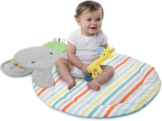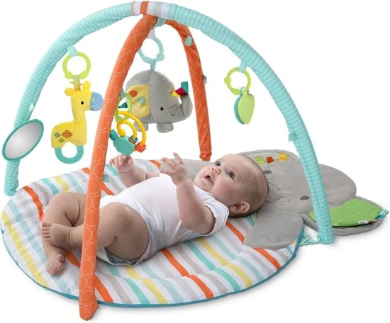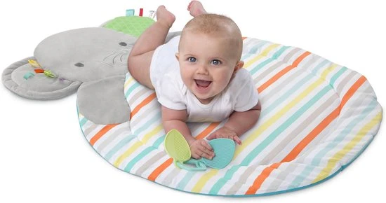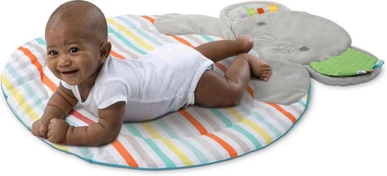 Wat een leuk speelkleed van Bright Starts voor je kindje! Het speelkleed heeft een afneembare speelboog met 6 verschillende leuke speeltjes. Hij bevat o.a. een spiegeltje, rammelaar, een bijtring en een pluche olifantje die 15 minuten lang melodietjes afspeelt! De speeltjes zijn ook los te gebruiken.