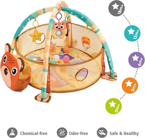 Deze speelmat zit boordevol plezier. Hij wordt geleverd met vier figuurtjes die ieder een andere unieke vorm heeft. Er zijn ook kleurrijke ballenbakballen bijgeleverd die het erg leuk en speels maken. Daarnaast is de grote speelmat die niet alleen visueel stimulerend, maar ook nog eens erg comfortabel. Wat echt uniek is, is de verstelbare pop-up mesh zijkant, die kan worden gebruikt om bijvoorbeeld de ballenbak dicht te maken tijdens het spelen.
