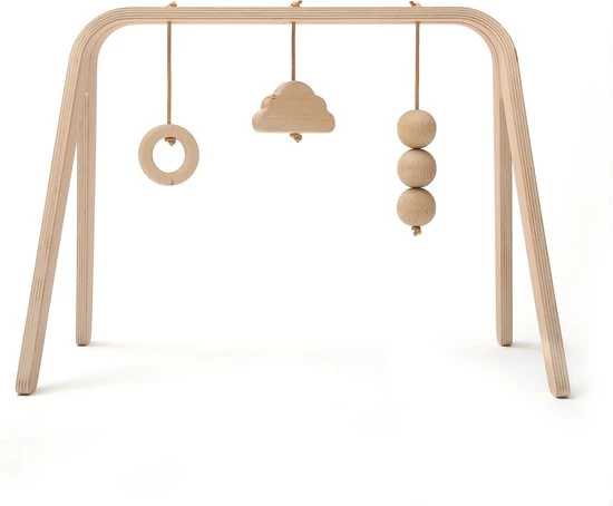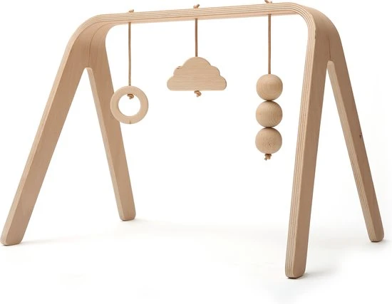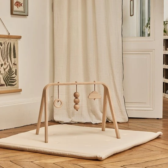 De houten Naho baby gym staat perfect op Charlie Crane’s Tami speelkleed of boven het houten Levo wipstoeltje.