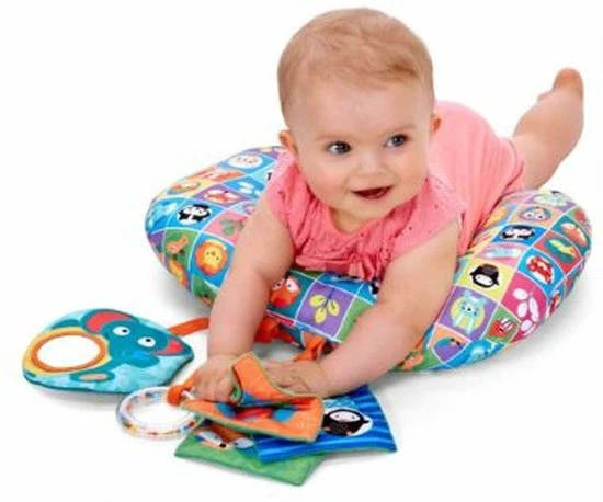 Het kussen heeft drie verschillende speeltjes die kunnen worden losgehaald: een ringrammelaar met gekleurde balletjes, een olifant met spiegeltje en een knisperboekje met drie verschillende pagina’s. De speeltjes moedigen jouw kindje aan het hoofdje op te tillen om de verschillende kleuren, geluidjes en texturen van de speeltjes te kunnen ontdekken.