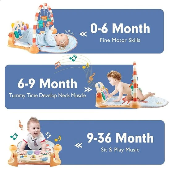 • Ontwikkel fijne en grove motoriek: met 5 schattige rammelaarhangers die je kleintje aantrekken om te grijpen en te schudden. De kick-geactiveerde piano is speciaal ontworpen voor peuters van 0-3-6 maanden, de vrolijke kindermuziek stimuleert baby’s om te trappen. Baby Play gyms moedigen baby’s aan om spieren in armen, benen, buik, rug en nek te gebruiken en te ontwikkelen. Het stimuleert de hand-oogcoördinatie, fijne en grove motoriek.
