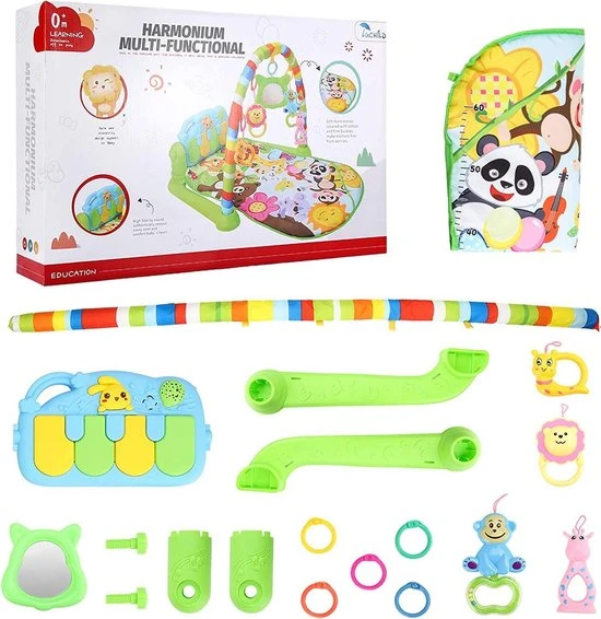 • Muziekbelevingsmat bestaat uit een zachte en kleurrijke deken met grappige dierenmotieven, een speelboog met 4 rammelaars en een spiegel, evenals een draaiende en afneembare piano