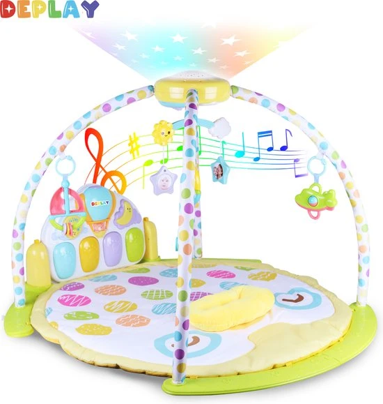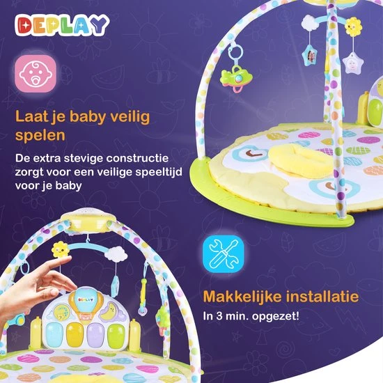 De DEPLAY BabyGym draagt bij aan de ontwikkeling en groei van je baby. Zie hoe je kindje zich, door bijvoorbeeld de babygym speeltjes aan de speelboog of de toetsen van de piano ontwikkelt en plezier maakt. Door de speeltjes, SterrenProjector en 3-in-1 Piano valt overal wat te zien of horen waardoor je kindje zich niet alleen visueel en auditief sterk ontwikkelt, bovendien worden naast de zintuigen ook de armen en benen getraind waardoor de DEPLAY BabyGym optimaal bijdraagt aan een snelle én leuke ontwikkeling van je kleine. Daarnaast groeit de BabyGym mee met je kindje en zo kan je pasgeboren baby (tot 6 maanden) eerst alles verkennen terwijl die op zijn rugje ligt. Naarmate je kindje groeit (vanaf ca. 6 maanden) kan je kleine ook op de buik liggend en kruipend spelen en doordat de piano verstelbaar is, kun jij je kindje later (vanaf ca. 12 maanden) ook nog zittend aan de piano laten spelen. De BabyGym van DEPLAY is niet voor korte termijn doordat het educatief speelgoed is. Zo kan je kleine voor meerdere jaren spelen en genieten van de BabyGym!