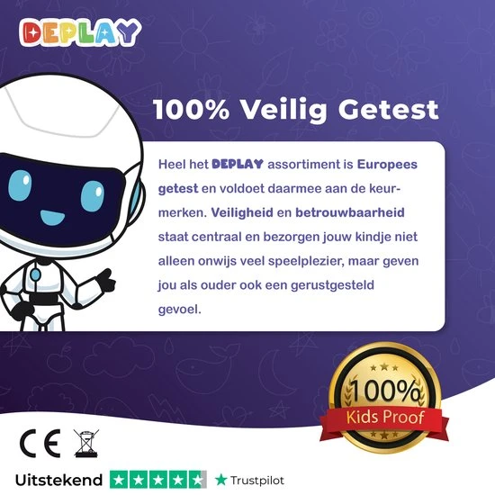 DEPLAY staat voor Developing & Play en is opgericht om baby’s, peuters en kinderen op een zo leuk mogelijke manier te vermaken en ontwikkelen in hun jongste jaren. Heel het DEPLAY assortiment is Europees getest en voldoet daarmee aan de keurmerken. Veiligheid en betrouwbaarheid staat centraal en bezorgen jouw kindje niet alleen onwijs veel speelplezier, maar geven jou als ouder ook een gerustgesteld gevoel. Developing & Play voor het hele gezin!