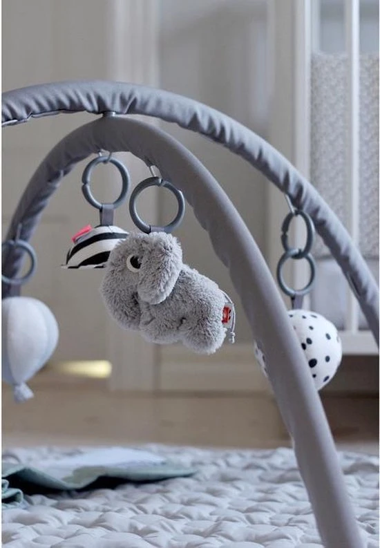 Croco kraakt, Elphee rammelt, het kleine spiegeltje (zwart/witte strepen) zal terug lachen naar je kleine en de ballonnen (effen wit of wit met zwarte dots) hebben een belletje in zich – dit alles om de baby flink te stimuleren.