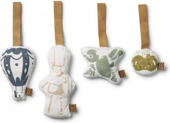Deze vier leuke speeltjes stimuleren je baby en zijn een prachtige aanvulling voor elke babygym of speelboog. Alle vier zijn ze gemaakt van zacht katoen en elk met een andere verrassing binnenin. Je hangt de speeltjes op met behulp van de lederen riempjes.