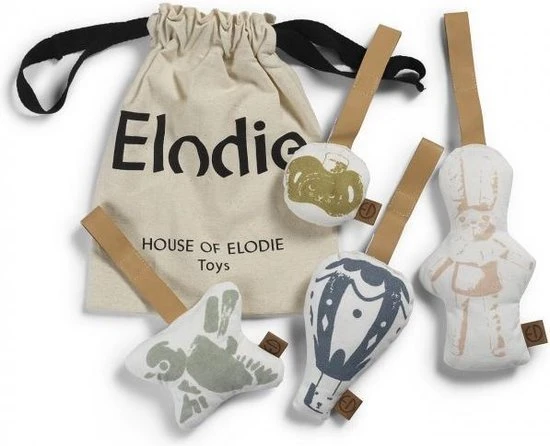 De speeltjes behoren tot het House of Elodie concept van baby & kindermerk Elodie. House of Elodie is een 3-in-1 babygym dat kan transformeren van speelgoed tot meubel. Van een babygym met speelgoed tot een knuffel- en speeltent voor poppen tot een kledingrek!