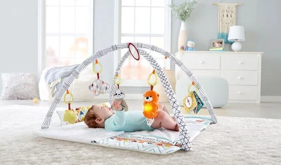 Stimuleer alle 5 de zintuigen van je baby met de dierlijke aantrekkingskracht van de Perfect Sense™ Luxe Speelmat van Fisher-Price. Deze super-comfortabele speelmat met ondersteunend kussen voor als je baby liggend op de buik wil spelen, is het perfecte startpunt van waaruit jouw kleintje een grote zintuiglijke avonturenreis kan beginnen. Van de lichtjes en muziek van de vriendelijke otter, tot het bijtspeeltje in de vorm van een blad, of de pluchen luiaard, de geurige wolk en meer, er is van alles te ontdekken op deze luxe babyspeelmat. Er is zelfs een uitvouwbaar meetgedeelte voor de maandelijkse fotosessie! Waar ontwikkeling en spel samenkomen Zintuigen: Op deze speelmat is onder meer van alles te zien, te horen, en te voelen – naarmate je baby de leuke speelmogelijkheden ontdekt, worden alle zintuigen gestimuleerd! Grofmotorische vaardigheden: De grappige dierenvriendjes boven hun hoofd stimuleren baby’s om te reiken en te tikken tijdens het liggen en spelen, wat hun grofmotorische vaardigheden versterkt. Fijnmotorische vaardigheden: Door de speeltjes vast te pakken en het bijtspeeltje naar de mond te brengen voor kauwplezier worden de behendigheid en oog-handcoördinatie van je baby versterkt.