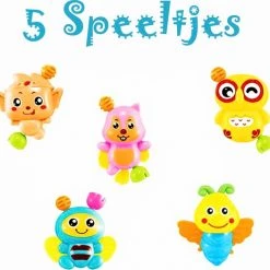 - 5 verplaatsbare speeltjes met zintuiglijke elementen: muzikale otter die oplicht, lekker geurende wolk, ontdekkingsspiegel, bladvormige bijtring en pluchen luiaard