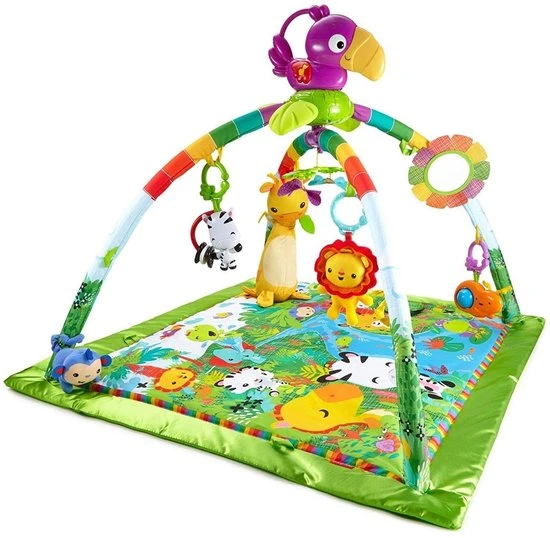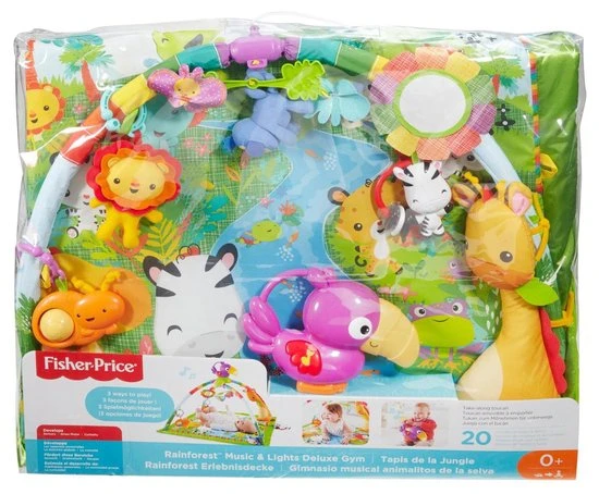 De Fisher-Price Regenwoud Muziek & Lichtjes Luxe Gym bevat urenlang speelplezier voor je baby, thuis én onderweg! Het knusse regenwoud komt tot leven met muziek, lichtjes en natuurgeluiden die reageren op de bewegingen van je baby, en bestaat uit meer dan 10 speeltjes die je kunt verplaatsen zodat je baby voortdurend iets nieuws kan verkennen. Met drie manieren om te spelen, een superzachte speelmat, een toekan voor onderweg en 20 minuten aan muziekjes en lampjes, zal je baby urenlang zoet zijn met deze luxe babygym.