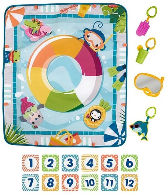 Deze speelmat met zwembadthema heeft felle kleuren, vriendelijke dieren en een detail van de binnenband waardoor het lijkt alsof de baby in het zwembad drijft. De mat wordt geleverd met 4 speelgoed accessoires, waaronder een ijslolly bijtspeeltje, een snorkelspiegel, een kreukelhaai en een limonade-rammelaar, plus 12 maandelijkse mijlpaalkaarten.
