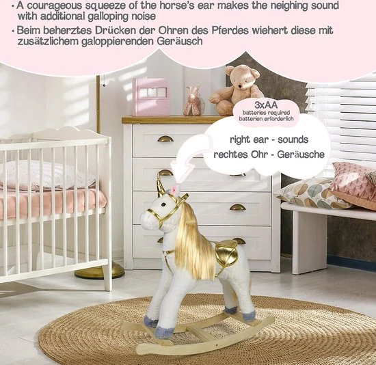 Ons kleine schommelspeelgoed is de perfecte metgezel voor je kind, die van dieren houdt en zijn reis naar de wereld van creatief spel en fantasie. Deze sierlijke harige vriend zal je schattige kleintjes urenlang leerplezier geven. Het eigenlijke hoogtepunt zijn de geluidseffecten, die door een moedige oorknop van je pluche vriend worden gecreëerd. Hüa!