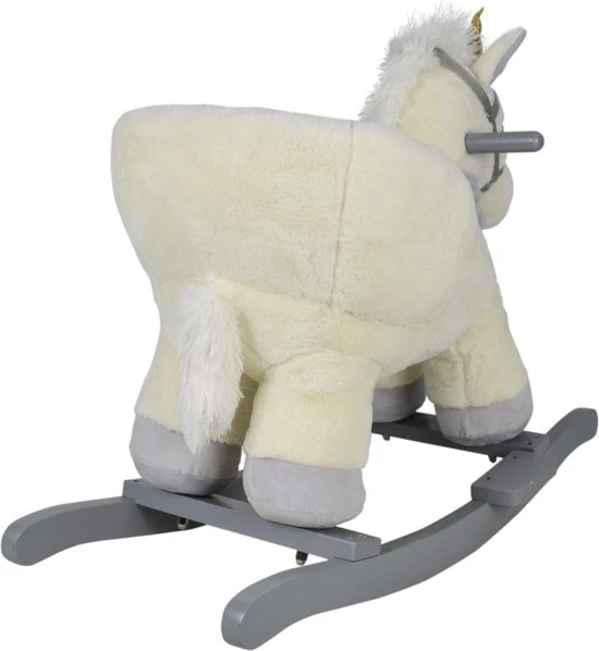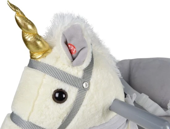 - Geluidseffecten: als je op het oor drukt, speelt het pluche en knuffelige hobbelpaard een slaapliedje.