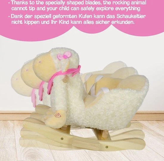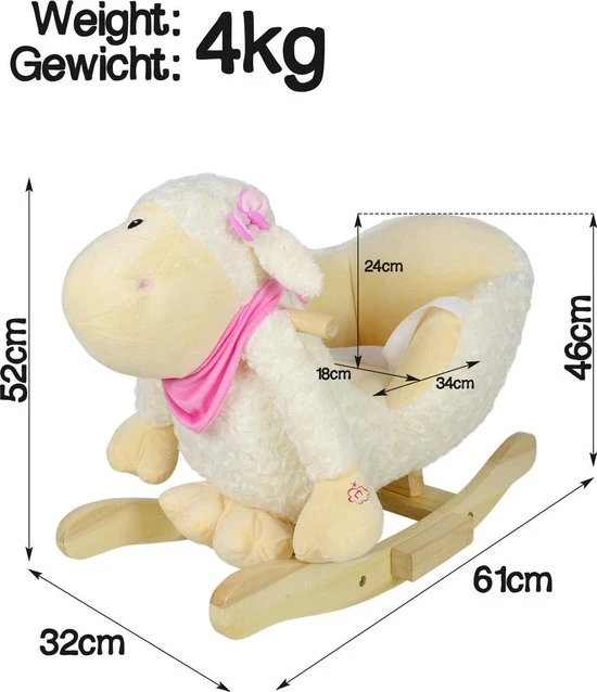 Type: schaap Productbeschrijving: Ons kleine schommelspeelgoed zou de perfecte metgezel zijn voor je kind dat van dieren houdt en van hun reis naar de wereld van creatief spel en verbeeldingskracht.Voor urenlang speel plezier. Voor de veiligheid van je lieve kleintje kun je achterover leunen en ontspannen. Het hobbeldier is voorzien van een verstelbare veiligheidsgordel en heeft twee praktische handvatten die je evenwicht bewaren, evenals voetsteunen die voor stabiliteit zorgen. Een driezijdige gezellige zithoek en daarbovenop een muziekfunctie – meer heeft uw kind niet nodig om te beginnen met spelen. Technische informatie: Lieveheersbeestje Afmetingen: Totaal (L / B / H): ca. 61/32/52 cm Zitgedeelte (L/B/H): ca. 34/18/24 cm Zithoogte (H): ca. 22 cm Gewicht: ca. 4 kg Belangrijke kenmerken: Muziek functie: Voet: welterusten deuntje max. draagvermogen: ca. 30 kg Benodigde batterijen: 2 x AA (niet inbegrepen) Materiaal: Populierenhout Ijzeren frame Polyester / pluche hoes Polyester veiligheidsgordels en vulling Leveringsomvang: 1 x hobbeldier, lieveheersbeestje om zelf in elkaar te zetten, incl. 1 x instructie in (EN / FR / DE / IT) Opmerking: Decoratie is niet bij de levering inbegrepen. De kleuren kunnen afwijken van de afbeelding. Levering op eilanden is niet mogelijk. Batterijen zijn niet inbegrepen. Juridische kennisgeving Veiligheidsadvies: VOORZICHTIGHEID! Niet geschikt voor kinderen jonger dan 10 maanden. VOORZICHTIGHEID! Alleen voor privégebruik. VOORZICHTIGHEID! Alleen gebruiken onder direct toezicht van volwassenen.