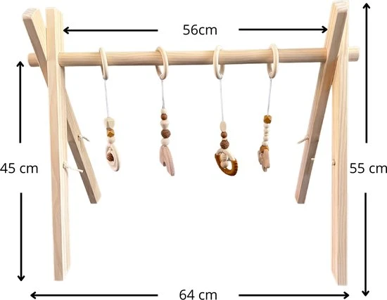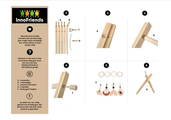 | Verpakkingsinhoud | 4, staanders, -, 1, dwarsligger, -, 2, houten, schroeven, -, 2, koordjes, -, 4, babygym, hangers, -, gebruiksaanwijzing |