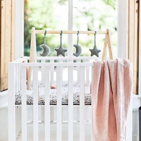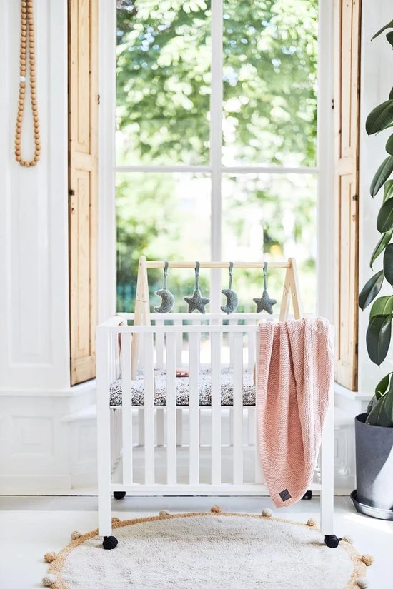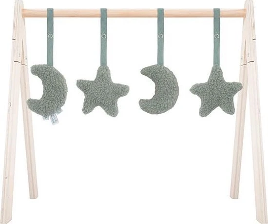 Deze vier speelfiguurtjes zijn geschikt voor gebruik in combinatie met de Jollein houten babygym. Het is van zachte teddystof in roze of groen. Vanaf ongeveer 10 weken krijgt je baby steeds meer behoefte aan prikkels, spelen en rondkijken. Dat is het moment dat een babygym die extra uitdaging biedt. Haal gauw de houten babygym in huis en versier deze met deze leuke figuurtjes in de vorm van twee maantjes en twee sterren. Leg je baby er onder op een zachte ondergrond en het spelen kan beginnen! De bewegingen van de speeltjes aan de babygym vindt je baby fascinerend om te zien. Hij zal enthousiast met zijn voetjes trappelen of geluidjes gaan maken als hij een speeltje weet te grijpen of aan te tikken zodat het nog meer gaat bewegen. Het gebruik van de babygym stimuleert de ontwikkeling van de grove en fijne motoriek. Het prikkelt de zintuigen. Bovendien krijgt je baby steeds meer controle over zijn grijptechnieken en het leert dat speeltjes meer gaan bewegen als je er tegen aan tikt of speeltjes vastgrijpt. Heel waardevol dus, zo’n babygym. De babygymspeeltjes van Jollein worden exclusief de houten babygym geleverd. De babygym is los verkrijgbaar en gemakkelijk in elkaar te zetten. In de Jollein collectie zijn meerdere bijpassende babygymspeeltjes verkrijgbaar. Je kunt de babyspeeltjes makkelijk bevestigen en weer verwijderen. Daardoor kun je afwisselen met de speeltjes en blijft het voor je baby interessant en uitdagend.