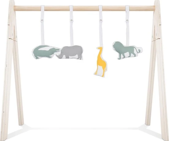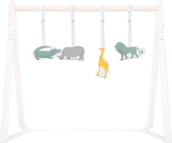 Deze vier safari speelfiguurtjes zijn geschikt voor gebruik in combinatie met de Jollein houten babygym. De dieren zijn verschillend van vorm en kleur: de leeuw en krokodil zijn groen, de giraf is geel en de neushoorn is grijs. Vanaf ongeveer 10 weken krijgt je baby steeds meer behoefte aan prikkels, spelen en rondkijken. Dat is het moment dat een babygym die extra uitdaging biedt. Haal gauw de houten babygym in huis en versier deze met deze leuke dierenfiguurtjes in contrasterende kleuren. Leg je baby er onder op een zachte ondergrond en het spelen kan beginnen! De bewegingen van de speeltjes aan de babygym vindt je baby fascinerend om te zien. Hij zal enthousiast met zijn voetjes trappelen of geluidjes gaan maken als hij een speeltje weet te grijpen of aan te tikken zodat het nog meer gaat bewegen. Het gebruik van de babygym stimuleert de ontwikkeling van de grove en fijne motoriek. Het prikkelt de zintuigen. Bovendien krijgt je baby steeds meer controle over zijn grijptechnieken en het leert dat speeltjes meer gaan bewegen als je er tegen aan tikt of speeltjes vastgrijpt. Heel waardevol dus, zo’n babygym. De babygymspeeltjes van Jollein worden exclusief de houten babygym geleverd. De babygym is los verkrijgbaar en gemakkelijk in elkaar te zetten. In de Jollein collectie zijn meerdere bijpassende babygymspeeltjes verkrijgbaar. Je kunt de babyspeeltjes makkelijk bevestigen middels een drukknoopje en weer verwijderen. Daardoor kun je afwisselen met de speeltjes en blijft het voor je baby interessant en uitdagend.