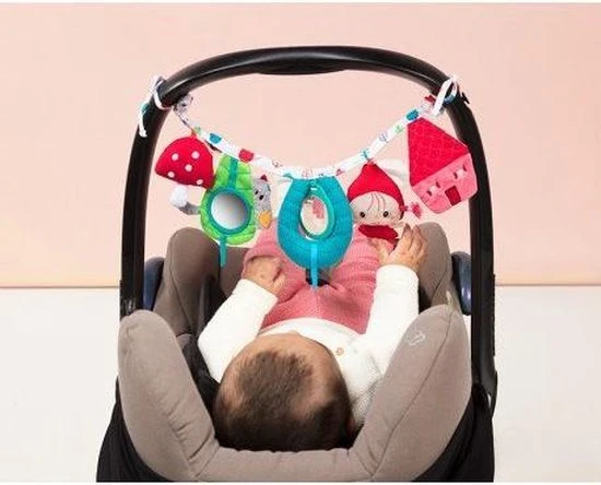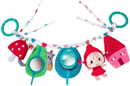 Je kindje vindt een ritje in de auto of een wandelingetje in de natuur veel leuker in het gezelschap van Roodkapje’s slinger boordevol verrassingen. Hij kan gemakkelijk vastgemaakt worden aan verschillende dragers: autozitje, buggy, relax… Geboeid door de kleuren, het spiegeltje en de verschillende texturen en geluiden vliegt de tijd voorbij! Met dit leuke speeltje wordt elk uitstapje een fantastisch avontuur.