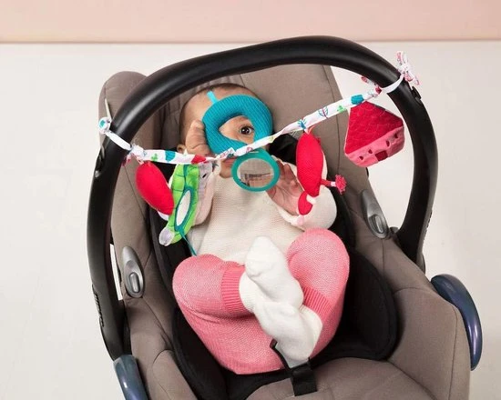 Bevat een spiegel, knisper geluidje, rammelaar, prisma, verschillende stofjes en linten om de baby een hele tijd mee bezig te houden.