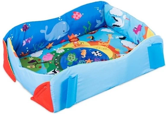 Dankzij de verhoogde zijkanten en klittenbandsluitingen op de hoeken, kan de mat in een paar seconden worden veranderd in een comfortabele box, die overdag als babyspeelcentrum zal dienen.