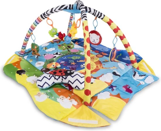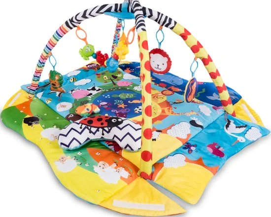 Zintuiglijke stimulatie. Kinderen in de eerste levensmaanden ontdekken de wereld vooral door te zien en te voelen. Deze Anika speelkleed zal de baby vertrouwd maken met vormen en kleuren, wat zorgt voor de ontwikkeling van zijn motorische en visuele coördinatie en ruimtelijke vaardigheden. Unieke afdruk. Anika is gebaseerd op levendige en kindvriendelijke kleuren die de aandacht trekken van een kleine ontdekker, terwijl hij zijn verbeeldingskracht en concentratievermogen ontwikkelt. Het patroon is zo ontworpen dat het kind al spelend dieren leert herkennen. Met behulp van de mat kan je kleintje leren over het prachtige verhaal dat op het patroon wordt gepresenteerd. Deze speelkleed heeft dubbelzijdig speelgoed met geluid. Wanneer dat op de handvat van het speelgeod wordt gedruks komen er verschillende geluiden uit, wat de baby aanmoedigt om ernaar te reiken en tegelijkertijd de spieren van de handen te oefenen. De bedrukking aan de ene kant van het speelgoed is van een andere kleur dan aan de andere kant. Tijd om je baby op de buik te leggen. Naast het speelgoed bevat de set ook een speciaal kussen om op de buik te liggen. Dankzij dit kan de baby tijdens het spelen de spieren van de armen en rug versterken, wat hem voorbereidt op het zelfstandig zitten. Een comfortabele ondergrond. Zachte en dikke vulling zorgt voor voldoende isolatie van de vloer. Dankzij deze zal de baby altijd warm hebben. In de lente- en zomerperiode kan de mat ook buiten gebruikt worden. Anika heeft een meerdere verificaties ondergaan in het onafhankelijke Intertek-certificering laboratirum. Het product voldoet aan de Europese veiligheidsnorm EN 71. Anika kan gebruikt worden als educatieve mat met bogen of als box met verhoogde zijkanten van de mat. Daarnaast kan de baby dankzij het kussen ook op zijn buik liggen, naast de standaard houding op de rug. Makkelijk schoon te maken. Het materiaal van de mat is niet alleen aangenaam om aan te raken, maar ook slijtvast en uiterst gemakkelijk schoon te maken. Handwasbaar tot 30 graden.