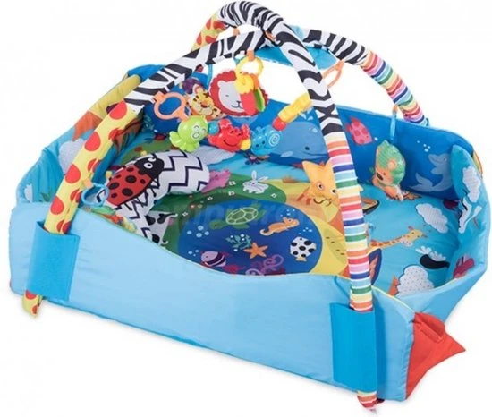Een rijke set speelgoed ontwikkelt motorische en handmatige vaardigheden. Speelgoed in verschillende vormen en kleuren heeft extra functies – individuele elementen ritselen bij aanraking, piepen en rammelen, wat de aandacht van de baby trekt. De set bevat ook een veilige bijtring en een flexibele spiegel.