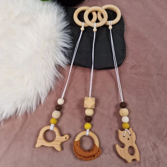 De babygym-hangers bestaan uit silicone en houten kralen (diameter 15 – 25 mm), in diverse vormen en kleuren (waaronder bruin, wit, okergeel en naturel). De houten ringen voor om de stok van de babygym-hanger hebben een buitendiameter van 60 mm en een binnendiameter van 40 mm.Onderaan de babygym-hangers zit een houten schildpad (ca 50 x 70 mm), een houten poes (ca. 50 x 70 mm) en een houten ring (diameter 55), halfrond afgewerkt met 70% katoen en 30% polyamide. Zie de foto voor de exacte detaillering.