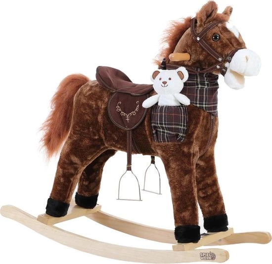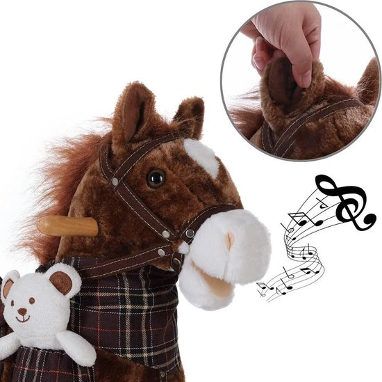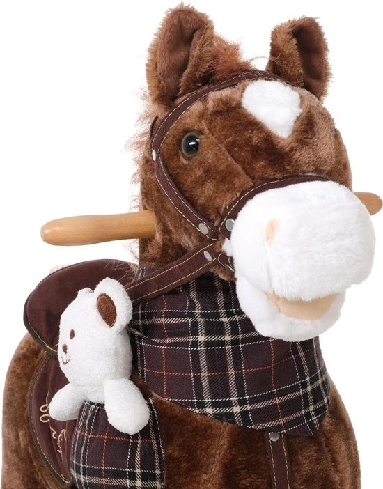 De knuffelbare paard heeft een houten frame met houten handvaten en is voorzien van een stijgbeugels. De stoel is gemaakt van zacht pluche. Als je op het oor van de paard drukt, worden er leuke geluiden gemaakt.