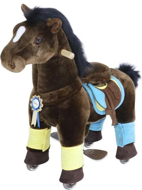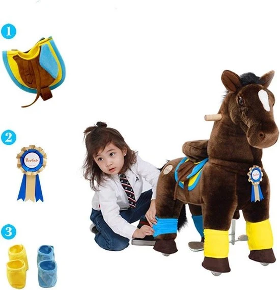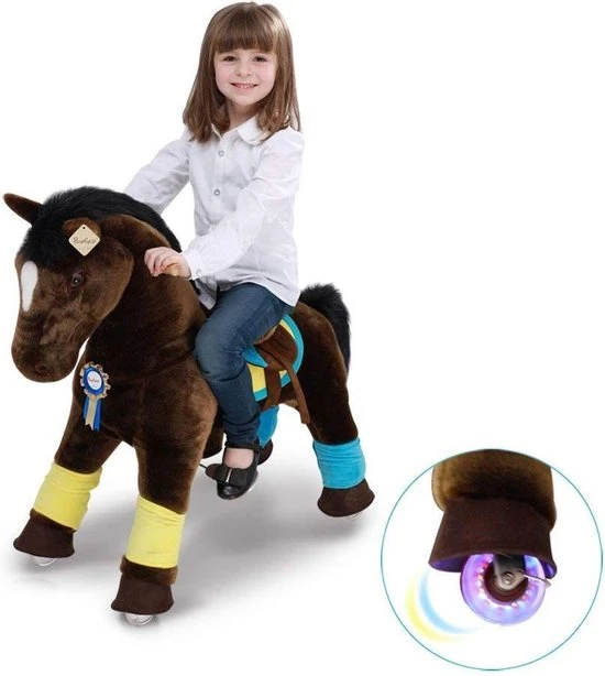 Zo heeft deze prachtige pony lichtgevende wielen bij het rijden, maar ook een accessoires pakket. Zoals peesbeschermers, een zadeltje en een mooie rozette.