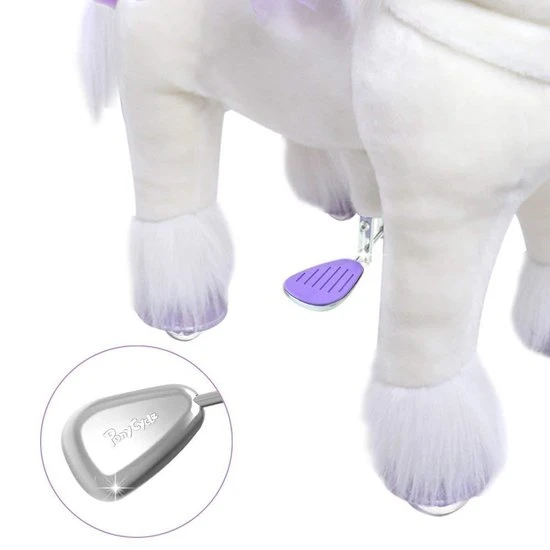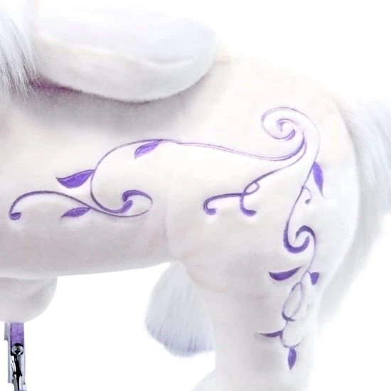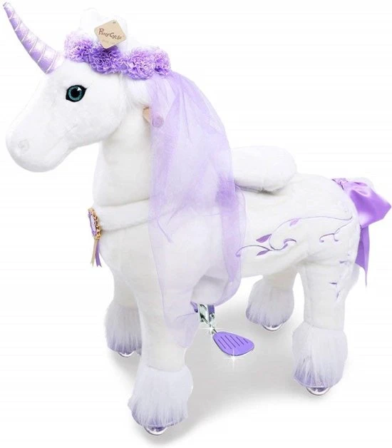 Zo heeft deze prachtige eenhoorn lichtgevende wielen bij het rijden, versiersels erin geborduurd, maar ook een accessoires pakket. Zoals een bloemenkrans, een strik en een mooie rozette.