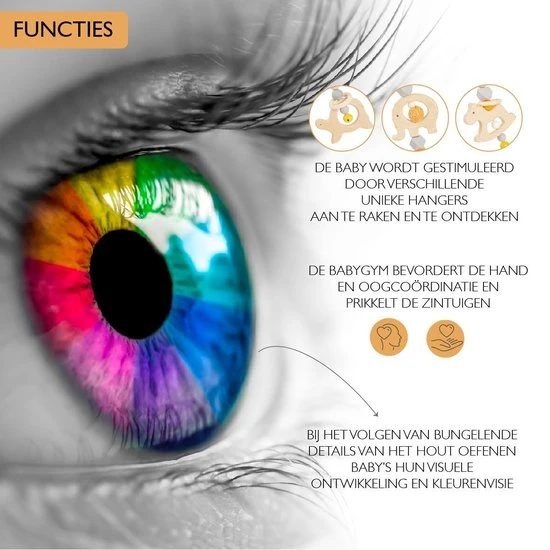 Met deze stoere houten babygym kan je baby zichzelf urenlang vermaken. De babygym bevordert de hand en oog coördinatie en prikkelt de zintuigen. Door het volgen van de bungelende details van het hout met hun ogen, oefenen baby’s bovendien hun visuele ontwikkeling en kleurenvisie op. Dit baby speelgoed is een leuk kraamcadeau dus!