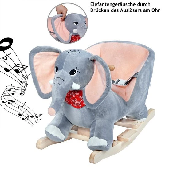 De knuffelbare olifant heeft een houten frame met houten handvaten en is voorzien van een veiligheidsgordel. De stoel is gemaakt van zacht pluche. Als je op het oor van de olifant drukt, worden er leuke geluiden gemaakt.