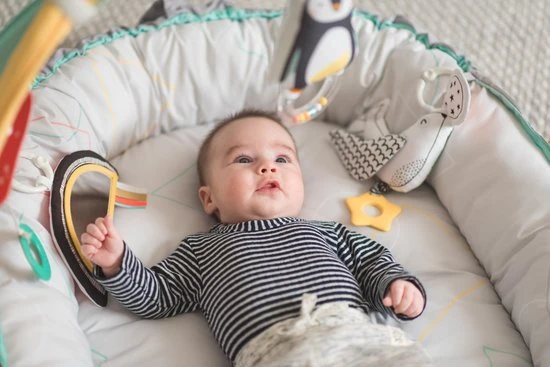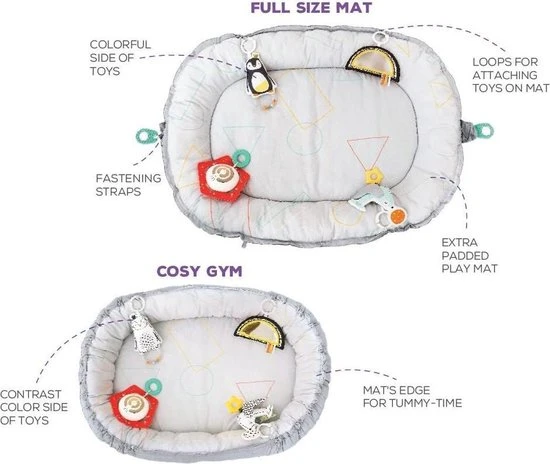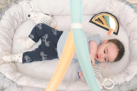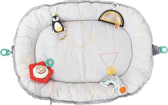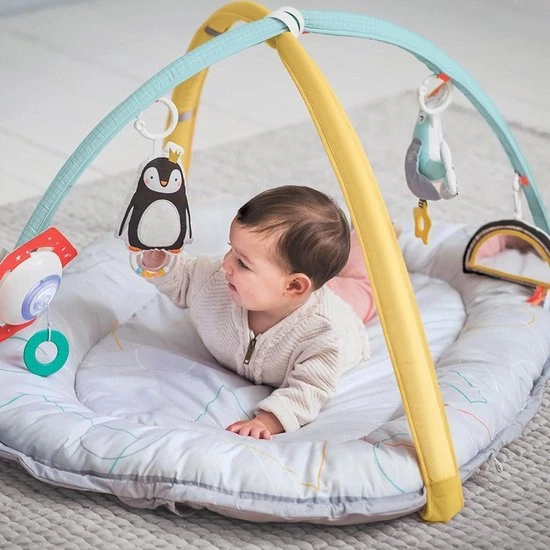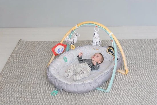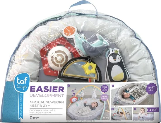 Het babynest van Taf Toys is een speelkleed en babynest in 1. Het kan gebruikt worden als een heerlijk zacht speelkleed in een ovale vorm. Wanneer je het koord in de rand van het babynest aantrekt wordt het speelkleed omgetoverd in een knus babynestje wat voor de kleine baby’s een veilig plekje is om de wereld te ontdekken. Je kan zelf kiezen of je de zachte bogen aan het babynestje plaatst. Aan de bogen hangen 4 verschillende speeltjes die zitten bevestigd met een plastic ring. Met deze ring kunnen de speeltjes ook los worden gebruikt en kan je ze aan de wandelwagen of box hangen. Dat zorgt voor extra veel speelplezier en herkenning voor je pasgeboren baby. de speeltjes zijn aan één zijde voorzien van vrolijke pastelkleuren en aan de andere kant zwart wit voor de pasgeboren baby’s. De speeltjes bestaan uit een zachte pinguïn met rammelaar, een zachte zeehond met bijtring, een spiegel in de vorm van een regenboog met verschillende voelfuncties en een afneembaar muziekdoosje gemaakt van plastic. Dit muziekdoosje wordt geactiveerd door aan het koord te trekken. ook kan het muziekdoosje worden bevestigd aan de wandelwagen of box.