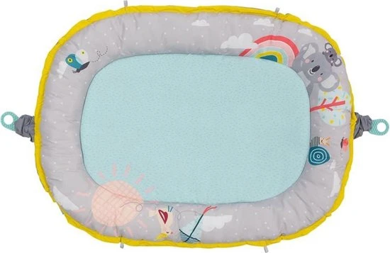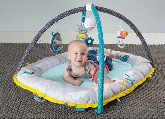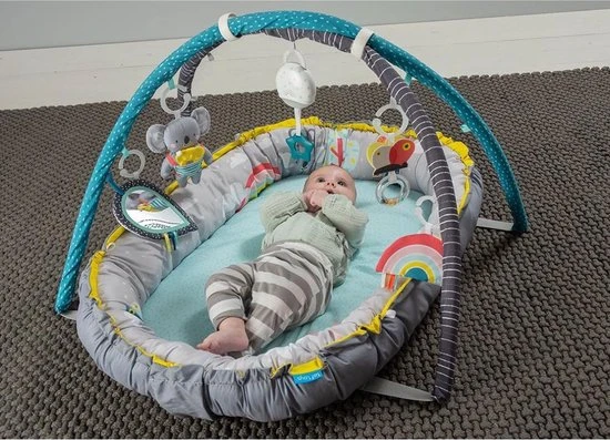 Fase 2 (3+ maanden). Vanaf 3 maanden maak je er – door de koordjes los te maken – een full-size speelmat van. De speelmat bevat 5 multi-sensorische speeltjes: koala met bijtring en speelzakje, vlinderrammelaar, knisperende regenboog, babyveilige bladspiegel en een muzikaal speeltje met kleurrijke lichtjes. Het muzikale lichtspeeltje speelt 4 melodieën (in totaal 20 minuten) en wordt geactiveerd wanneer je baby eraan trek. Zo leert je baby over oorzaak en gevolg. Spelen met het hangende speelgoed stimuleert de ontwikkeling van de zintuigen van de baby, de fijne en grove motoriek en de oog-handcoördinatie.