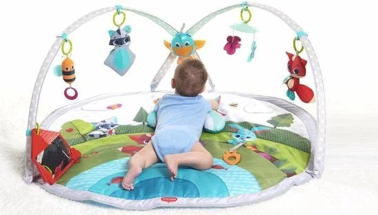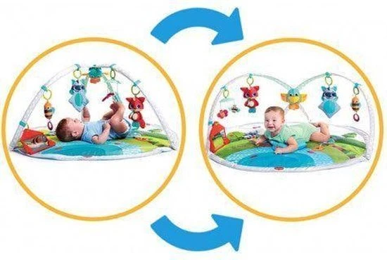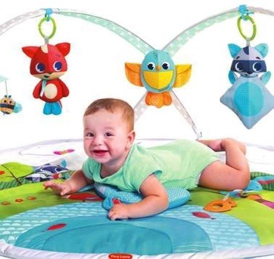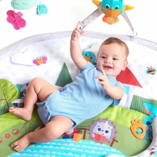 Deze unieke en veelzijdige Dynamic Gymini uit de serie Meadow Days van het merk Tiny Love stimuleert de ontwikkeling van de fijne en grove motoriek vanaf dag één. De activiteitenmat heeft verstelbare bogen die zich aanpassen aan de leeftijd van je kindje en het stadium waarin je kindje zich bevindt. Het elektronische opname apparaat in de vorm van een schattig vogeltje geeft licht en muzikale feedback. Dit stimuleert de ontwikkeling van taal, kennis en communicatie. Tevens kunnen ouders het lieve gebrabbel van hun kindje opnemen en terug luisteren en peuters kunnen hun eigen berichtjes opnemen en terug luisteren. De brede mat biedt je kindje genoeg ruimte om comfortabel rond te rollen en later op te zitten en te spelen.