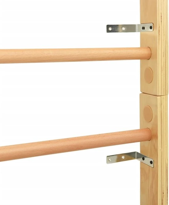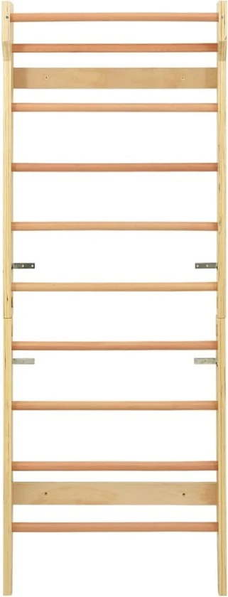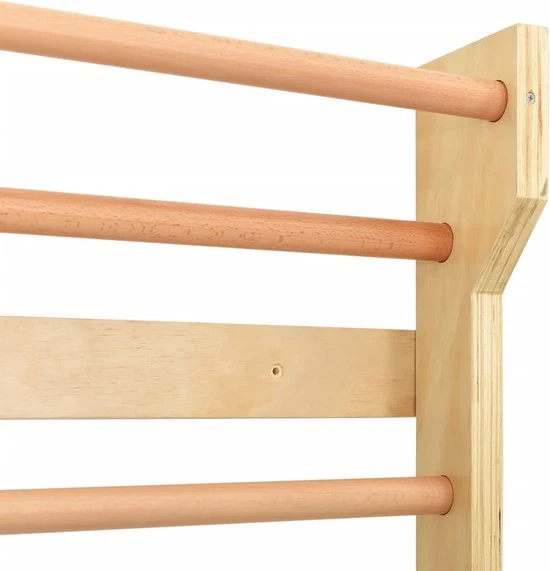 Deze gymnastiekladder is gemaakt van grenenhout, is zeer stevig en duurzaam en heeft een draagvermogen van 100 kg. De houten spijlen met afwerking zorgen voor veiligheid wanneer kinderen oefeningen doen op de ladder. Bovendien bespaard dit rek ruimte omdat het aan de muur moet worden bevestigd.